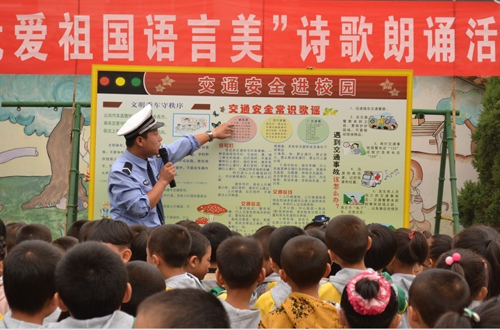 高平市公安局交警大队形式多样地开展了”牵手平安行“交通安全宣传活动,以此来进一步提高广大交通安全参与者的交通安全知识和自我防护意识,图为该大队宣传民警正在给金峰幼儿园的小学生们讲解交通安全知识,充分发挥了小手拉大手的宣传作用。