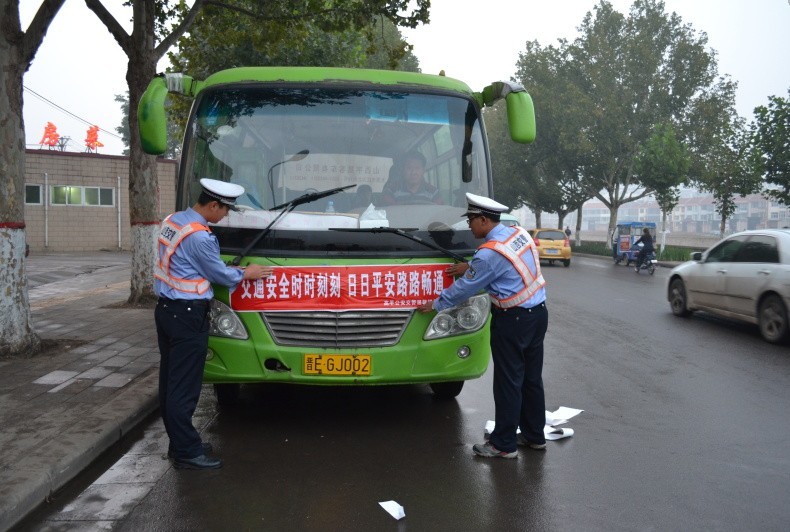 为了给党的十八大胜利召开创造良好的道路交通安全环境,高平市公安局交警大队开展了形式多样的”牵手平安行“交通安全宣传活动,告诫广大驾驶员文明行车、谨慎驾驶,确保出行安全。图为高平市交警大队民警正在向过往客运车辆粘贴交通安全提示语标语。