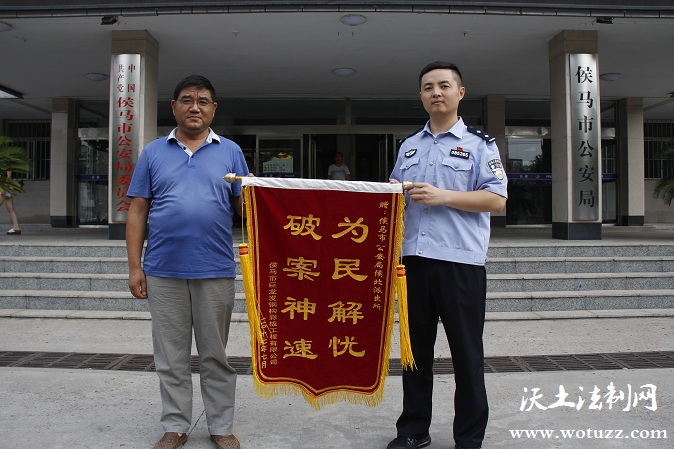 本网山西讯(记者张炜 通讯员郭清海)7月20日上午,侯马市公安局侯北派出所收到辖区侯马市某钢构彩板工程有限公司送来的一面绣有“为民解忧 破案神速”的锦旗,感谢该所民警迅速破案抓获嫌疑人,帮其追回被盗财物挽回了损失。 6月19日上午,侯马市某钢构彩板工程有限公司报案称,其停放在该市紫金山北街温泉花园一门店前的黑色小轿车两个倒车镜被人盗走,并留下微信联系方式索要钱财。
